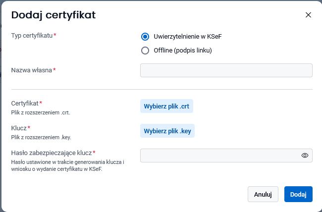 Jeżeli jednak planujecie Państwo korzystać również z modułu fakturowego, listę certyfikatów należy rozszerzyć o certyfikat offline (ten sam zestaw plików: .crt, .key i hasło), wygenerowany jednak przez stronę Ministerstwa Finansów z myślą o pracy w trybie KSeF offline24.