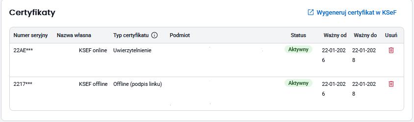 Po zapisaniu konfiguracji poprawnie dodany certyfikat pojawi się na liście ze statusem „Aktywny”.